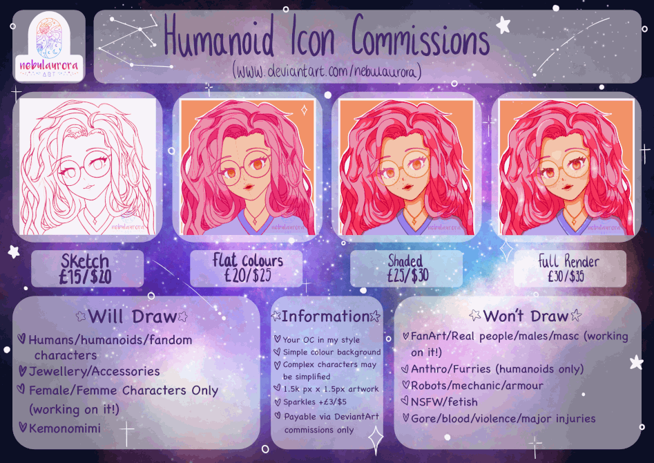 (@nebulaurora or @nebulaurora.art in most places. You can find more details in the here)☆ To be able to complete your commission visual references are needed. If you do not have visual references you will need to complete a form for your character. If you do not have a character, additional fees may apply, unless you are asking me to design a character/creative freedom. Full references or artwork help me greatly by reducing mistakes or guesses and it ensures I can fulfill your request.☆ Complex characters may be simplified depending on the type of commission, if you’re unsure if/how your character would be simplified do get in touch!☆ Be kind. If I think you are being rude, offensive or inappropriate at any point during the commission I will not continue working with you and cancel the commission. You will receive a refund of only 50% depending on how much work I have already completed. I will not tolerate negative behavior.•☽────✧˖°˖☽.☆.☾˖°˖✧────☾•Payment☆ Payment can be made either through Paypal invoices or DeviantArt☽Paypal Invoices